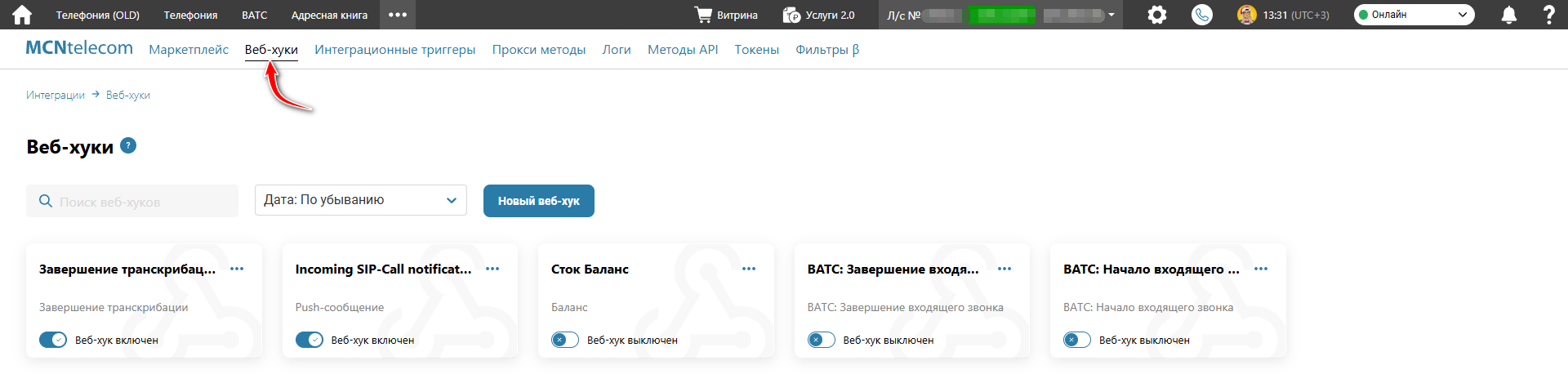 Веб-хуки (WebHooks) — это механизм оповещения системы о событиях. Например, когда происходит событие в MCN Telecom, веб-хук запрашивает адрес и параметры этого события, а затем предаёт их стороннему приложению.