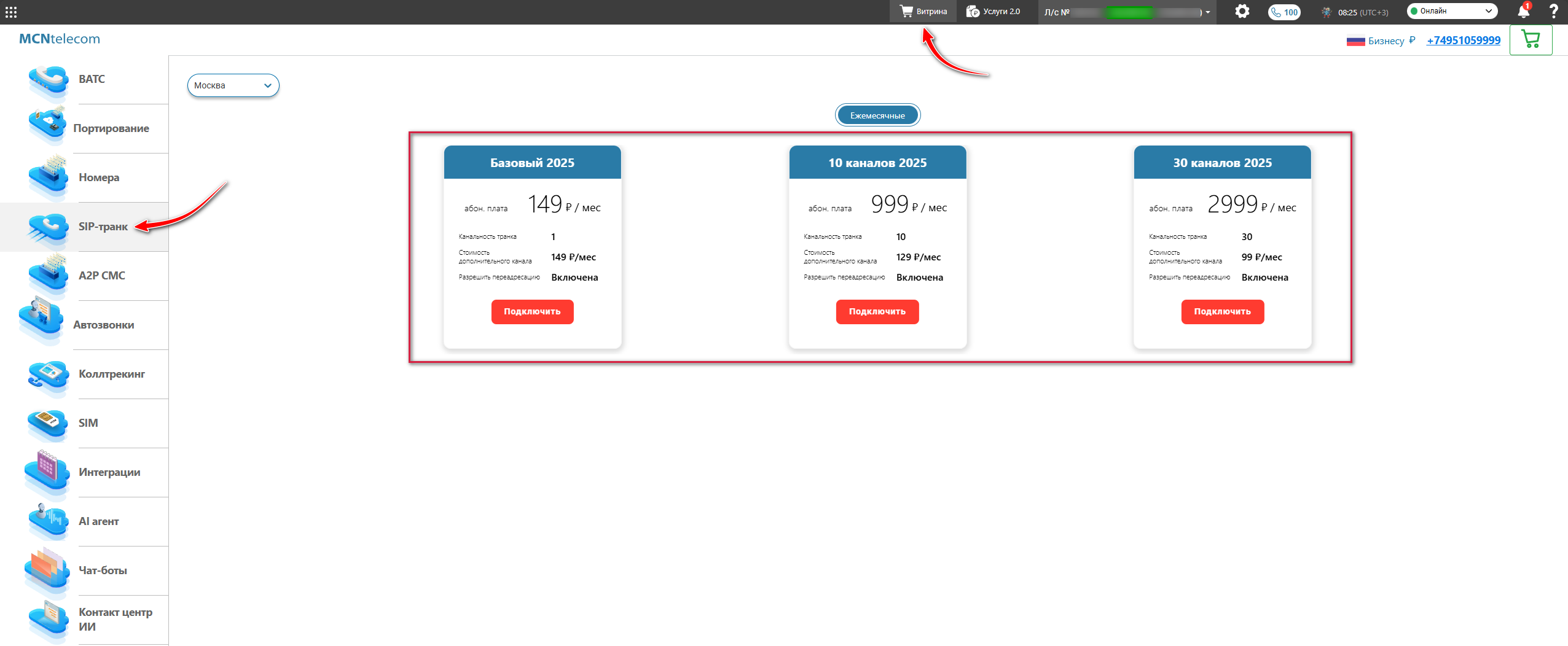1. В верхнем меню нажмите на иконку корзинки, чтобы перейти на витрину, затем в левом меню на «SIP-транк».