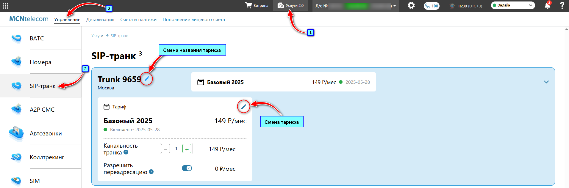 - Личном кабинете в верхнем меню перейдите на вкладку «Услуги 2.0» → вкладка «Управление» → в левом меню «SIP-транк». Здесь можно получить информацию по всем транкам, подключенным ранее, и увеличить количество каналов транка, входящих в тариф.