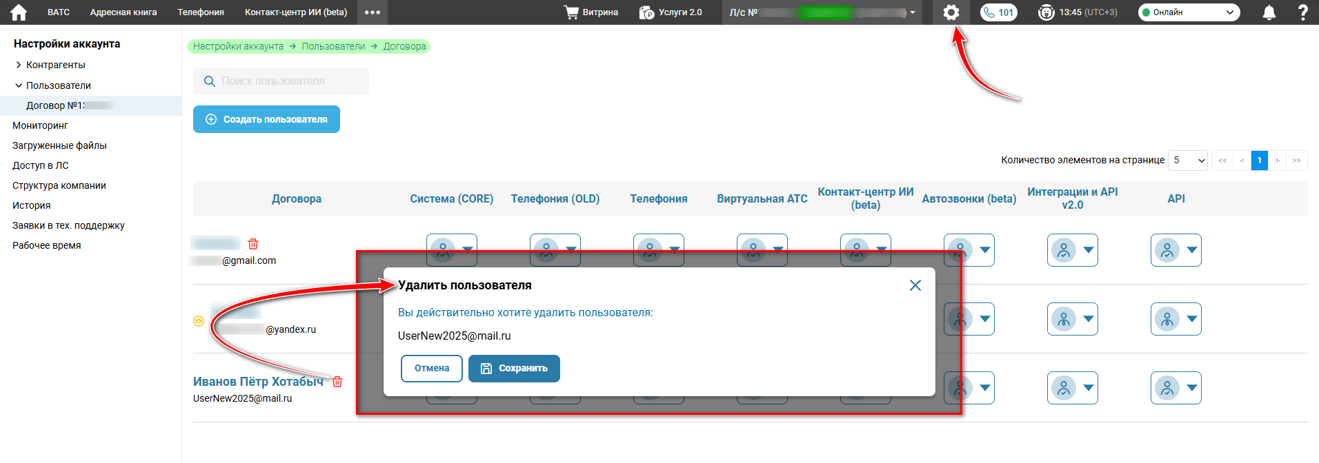 ✅ Примечание: Если удаляемый пользователь связан в внутренним номером виртуальной АТС, данный пользователь отвязывается от внутреннего номера. При этом вся информация по его звонкам сохраняется в системе. |