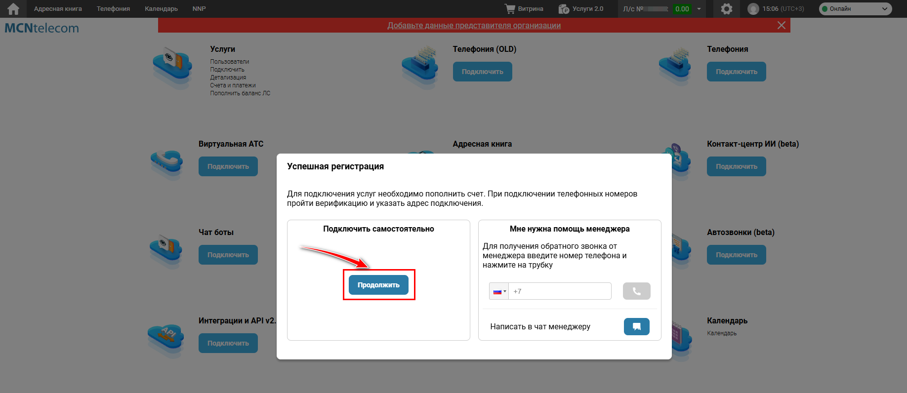 В личном кабинете, после регистрации откроется окно «Успешная регистрация» — выберите «Подключить самостоятельно» и нажмите на «Продолжить».