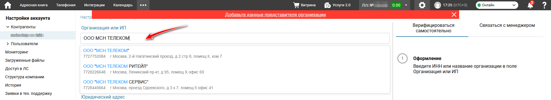В поле «Организация или ИП» укажите название организации или ИНН. Для удобства ввода информации вы можете воспользоваться поиском. Если ваша организация есть в списке, это упрощает заполнение данных. Начните вводить название организации, по мере ввода будут подставляться подходящие данные.