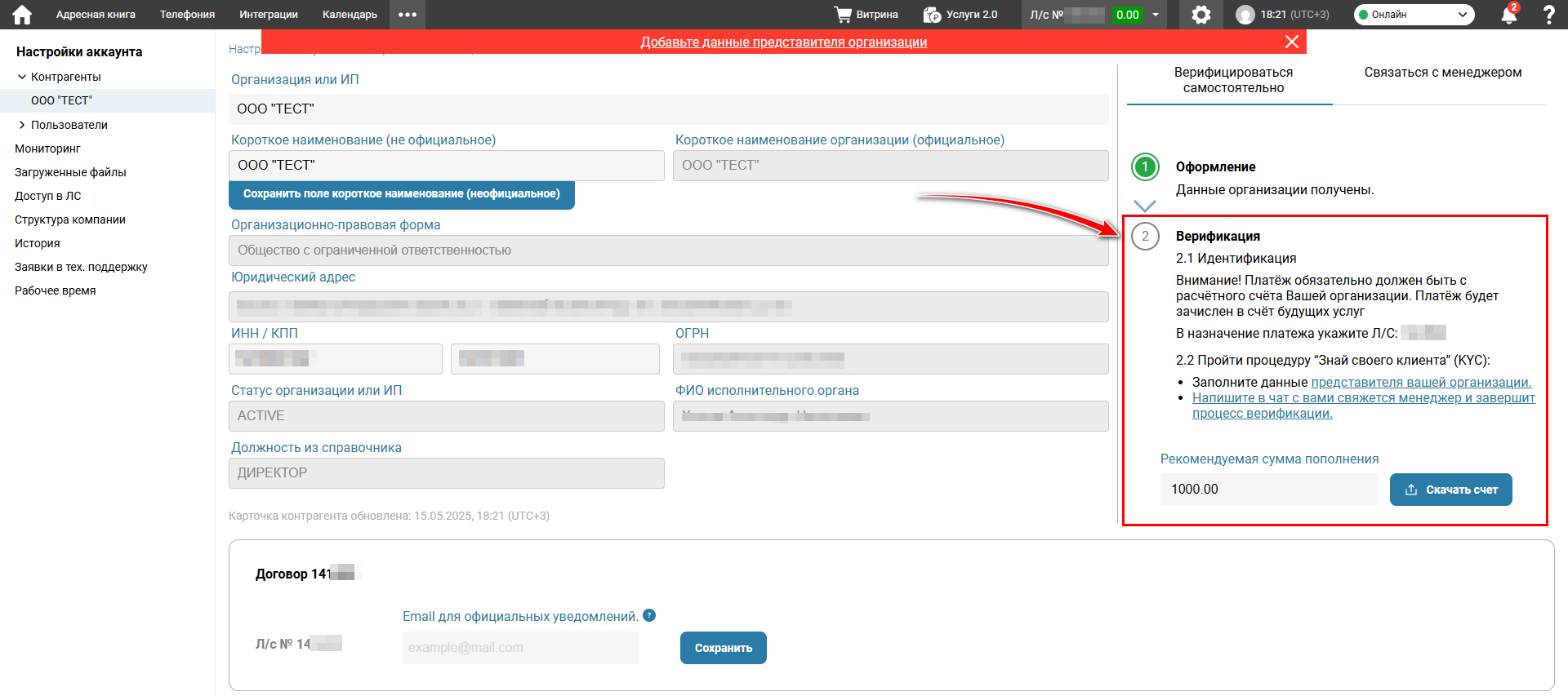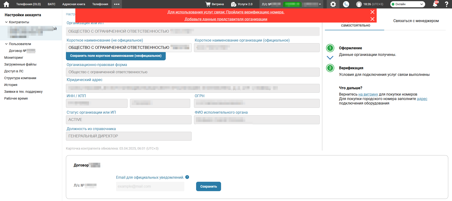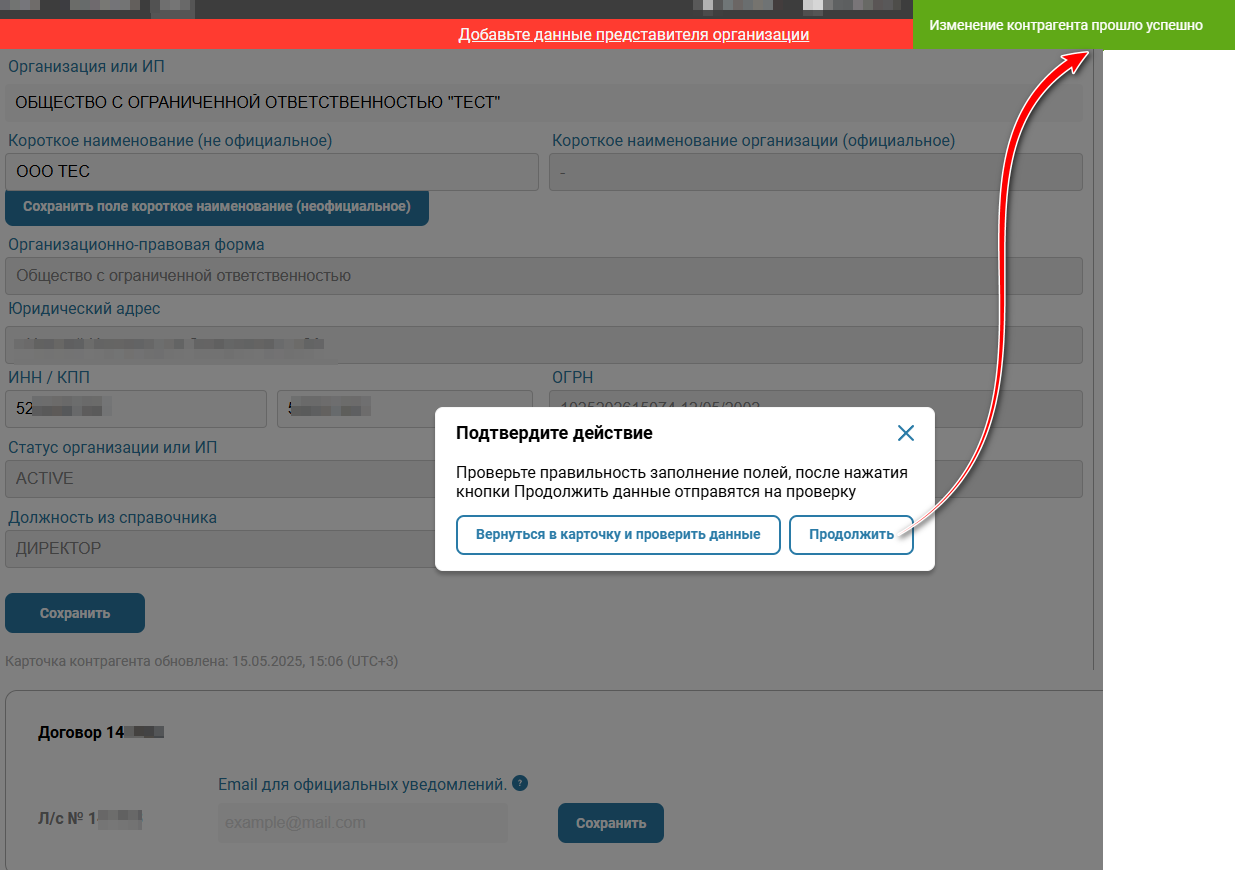 После выбора организации большинство полей заполнится автоматически. Необходимо указать «Электронную почту» для официальных уведомлений. После ввода всех данных — нажмите «Сохранить».