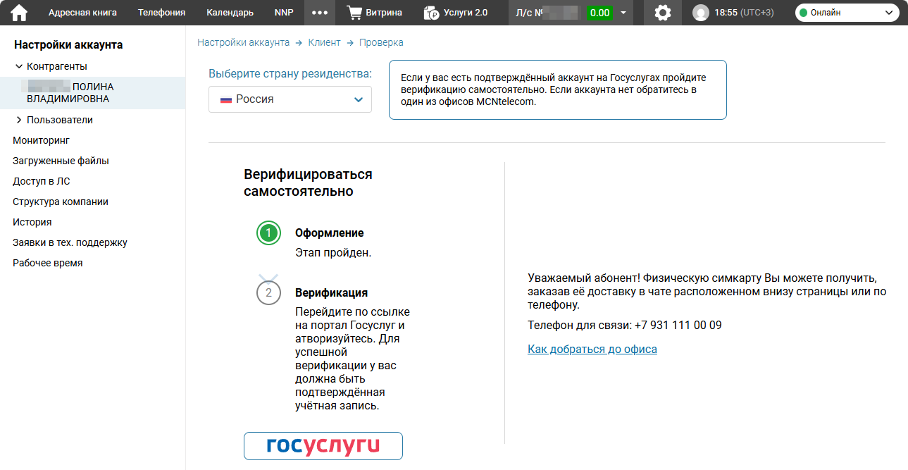 Условия для подключения услуг связи выполнены. Для использования услуг связи необходимо пройти верификацию номера и указать адрес подключения оборудования. См. «Как верифицировать номер» и «Как верифицировать адрес».