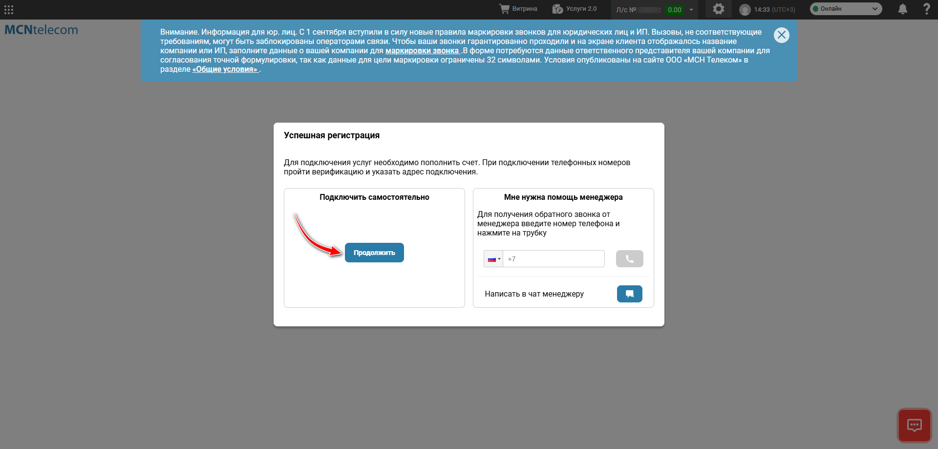 1. В личном кабинете, после регистрации откроется окно «Успешная регистрация» — выберите «Подключить самостоятельно» и нажмите на «Продолжить».