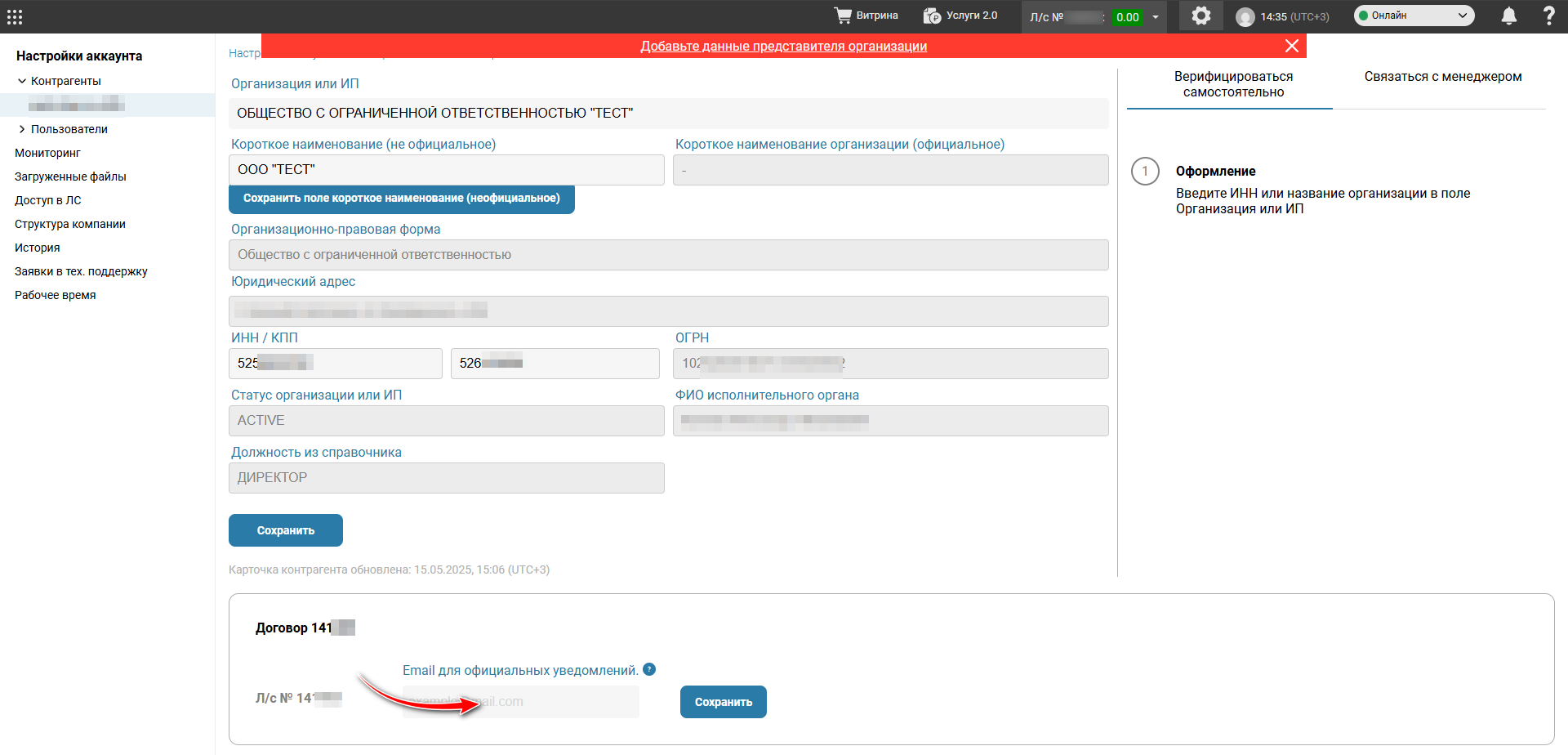2. После выбора организации большинство полей заполнится автоматически. Необходимо  указать «Электронную почту» для официальных уведомлений. После ввода всех данных — нажмите «Сохранить».