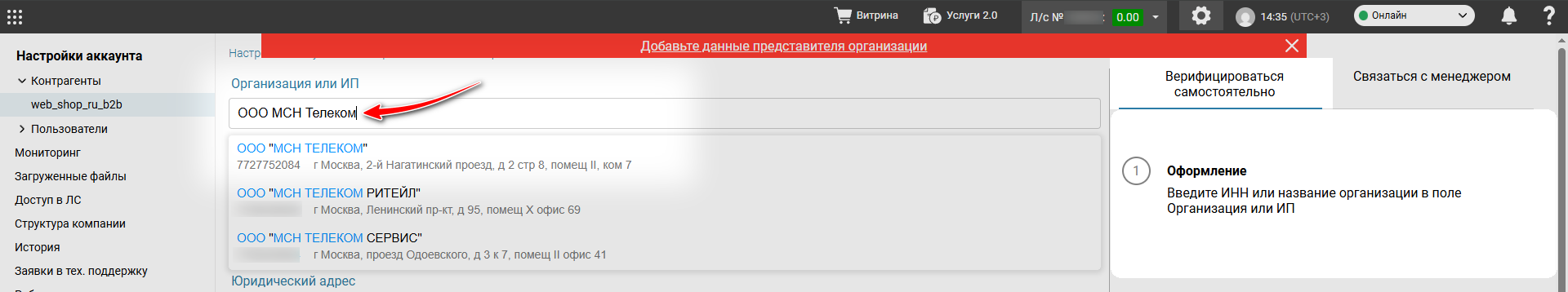 В поле «Организация или ИП» укажите название организации или ИНН. Для удобства ввода информации вы можете воспользоваться поиском. Если ваша организация есть в списке, это упрощает заполнение данных. Начните вводить название организации, по мере ввода будут подставляться подходящие данные.