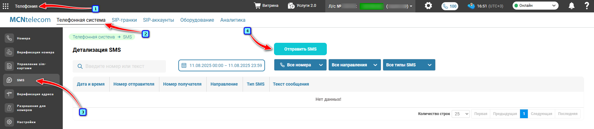 Отправка SMS доступна из раздела «Телефония» → вкладка «Телефонная система» → меню слева «SMS».