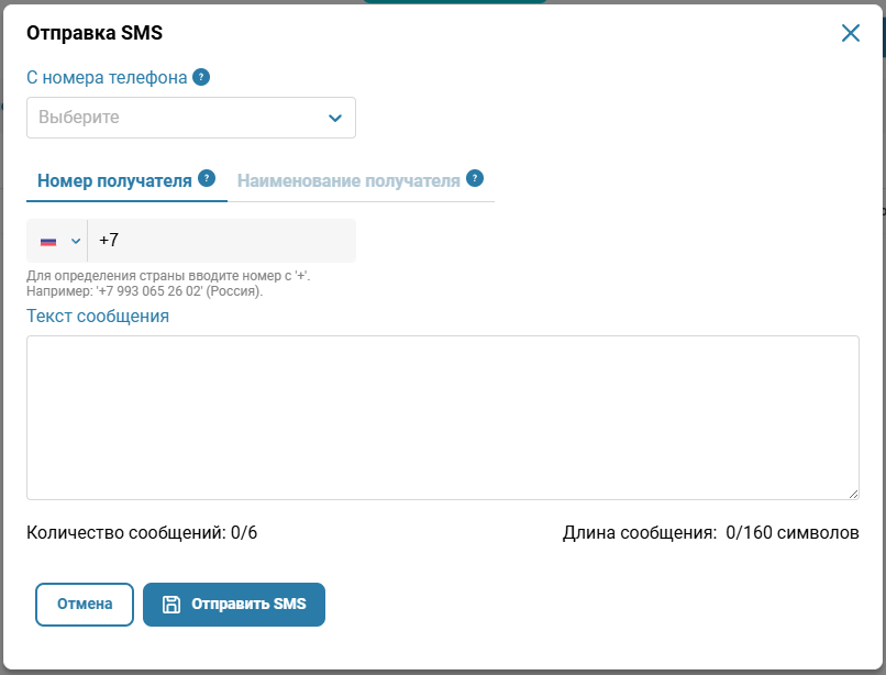 В открывшемся модальном окне «Отправка SMS» укажите следующие параметры: