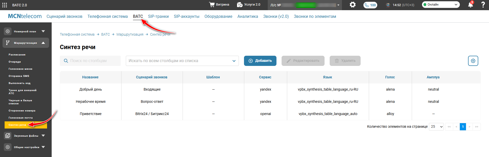 | ⚠️ Внимание! Перед настройкой услуги «Синтез речи» требуется подключить услугу. Подробней см. «Как подключить «Синтез и распознавание речи». |