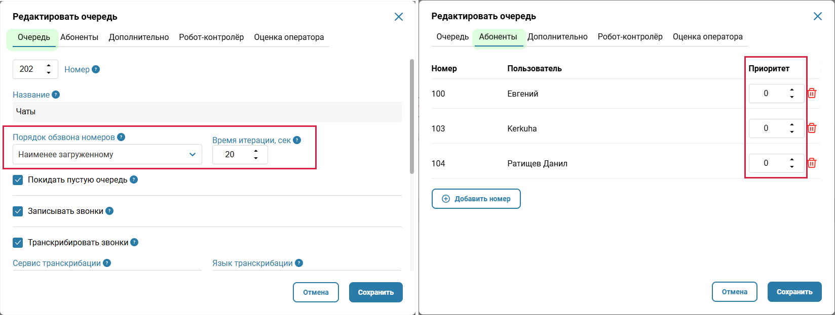 В очереди четыре оператора — два с «нулевым приоритетом» и два с «первым приоритетом», порядок обзвона — «По очереди».