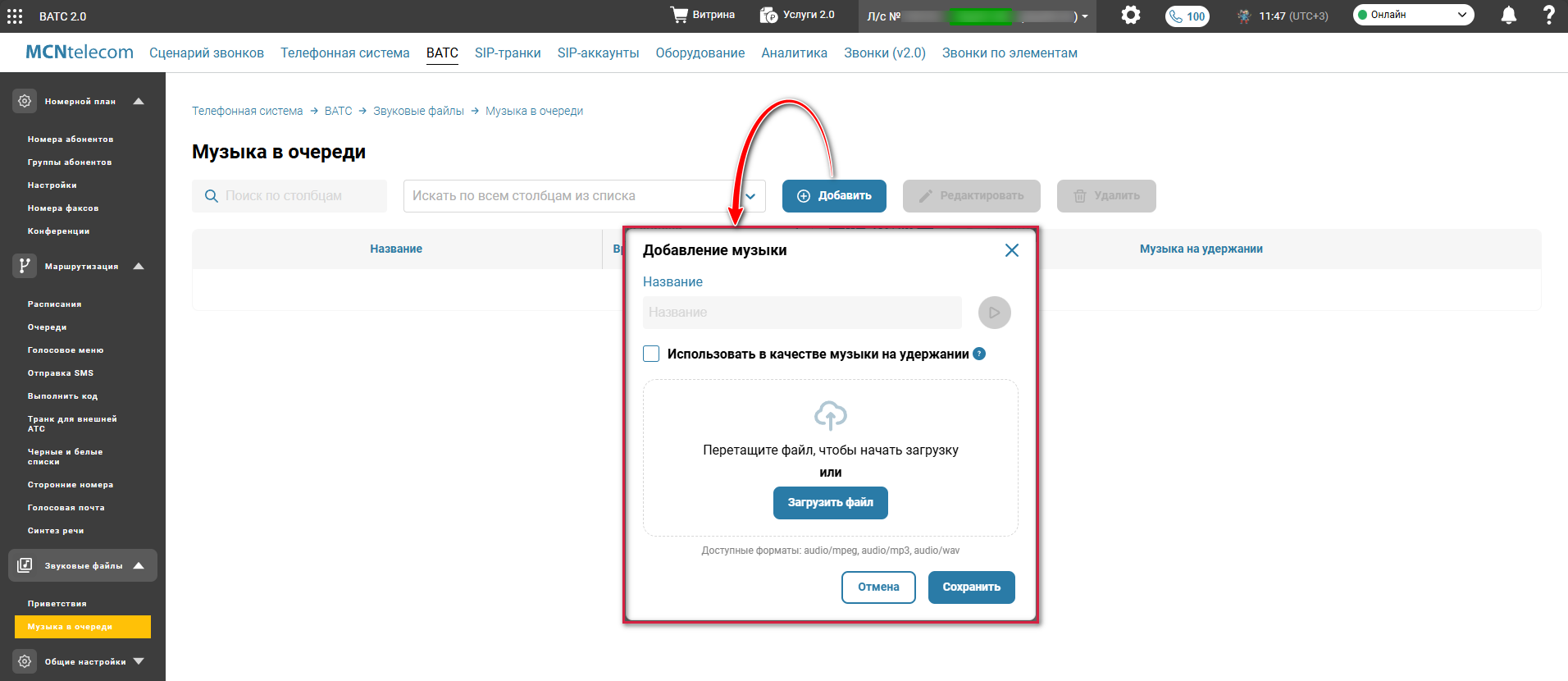 Для загрузки музыки в очереди и на удержании звонка в системе перейдите в раздел в раздел «ВАТС 2.0» → вкладка «ВАТС» → меню слева «Звуковые файлы» → «Музыка в очереди».