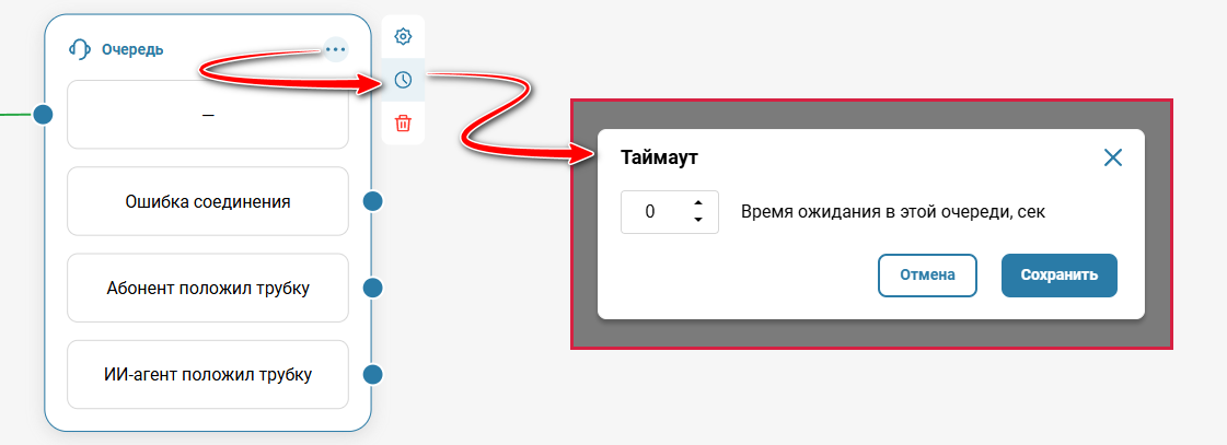Чтобы звонок не был упущен, когда все сотрудники заняты, укажите для очереди временной интервал, по истечении которого, звонок будет перенаправлен дальше по маршруту сценария.