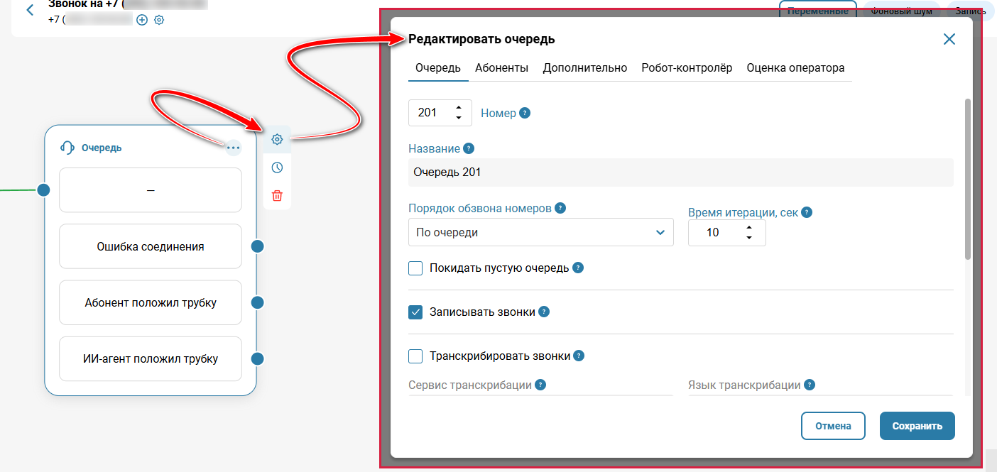 В разделе «Телефония» → вкладка «Голосовой бот», справа в боковом меню нажмите на три точки напротив элемента «Очередь».
