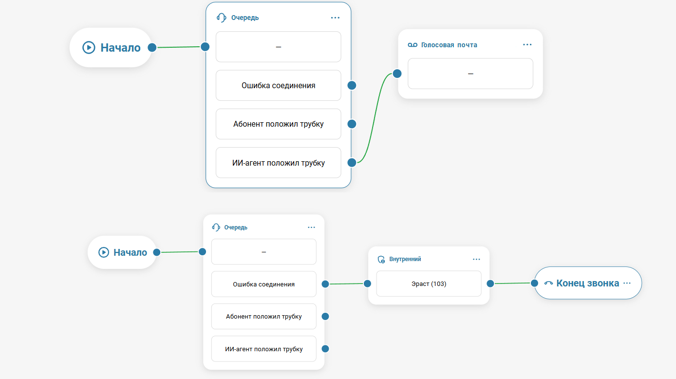 Например, можно переадресовать звонок на другую очередь, абонента или голосовую почту. Для этого на сценарии маршрутизации после элемента «Очередь» требуется добавить подходящий элемент и задать его настройки. Добавьте все необходимые элементы и соедините их стрелками для того, чтобы задать последовательность. Для сохранения схемы с настроенными элементами нажмите на кнопку «Сохранить».
