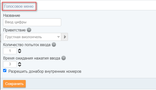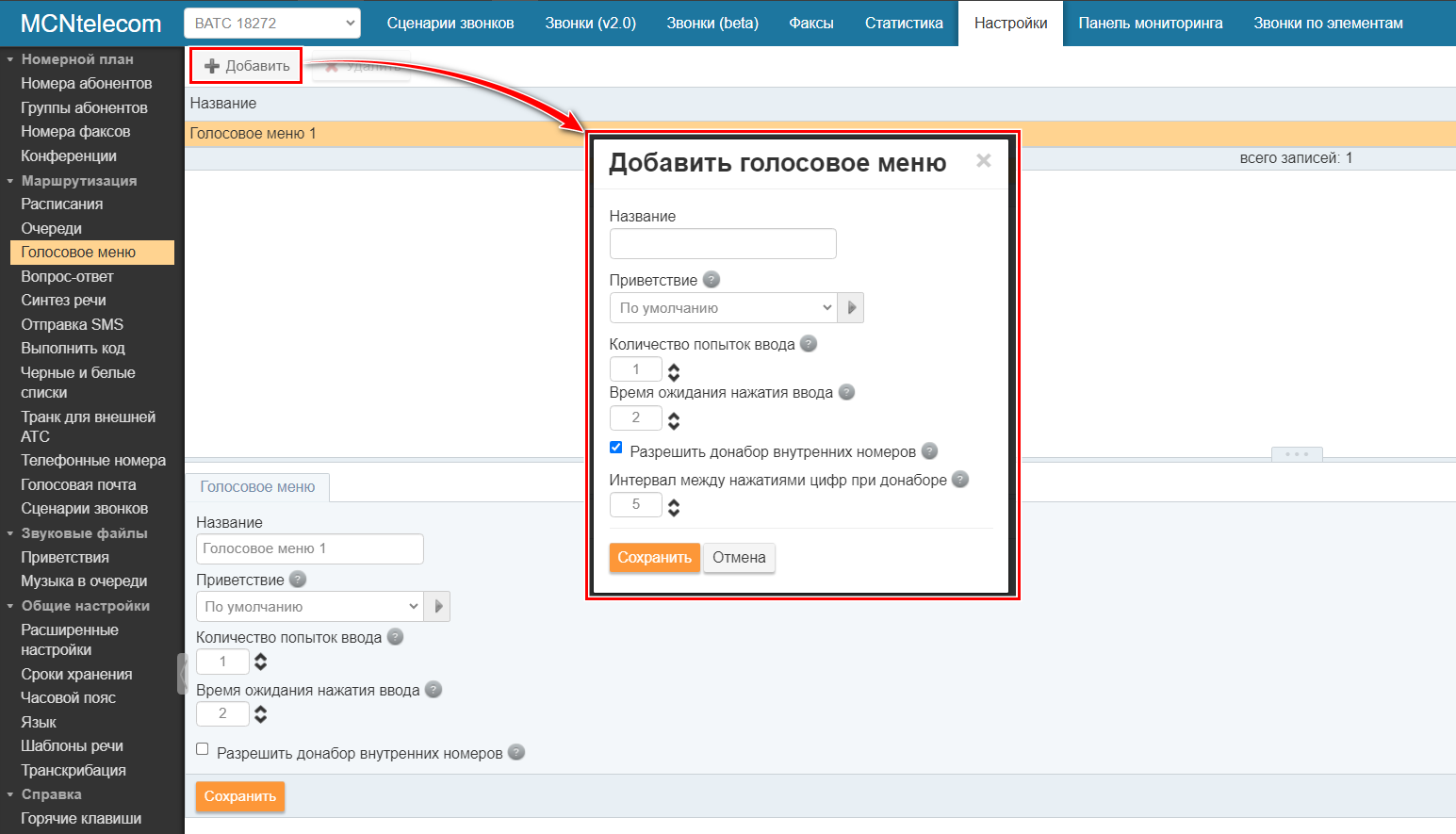 Нажмите кнопку «Добавить меню». Откроется форма создания голосового меню.