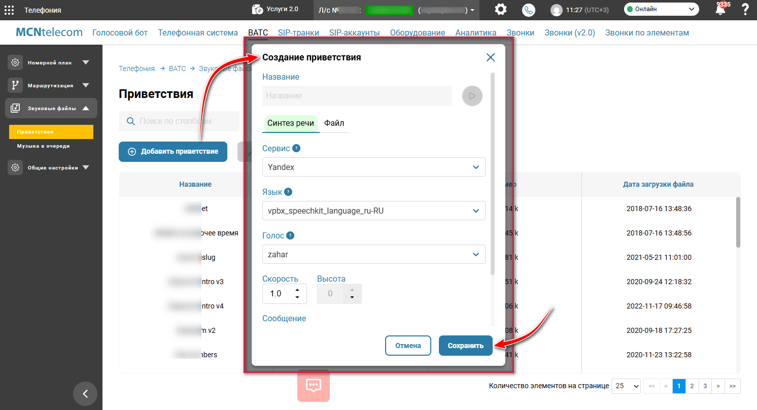 Чтобы использовать синтез речи для приветствия, должна быть подключена услуга «Синтез и распознавание речи». Подробнее см. «Как подключить «Синтез и распознавание речи».