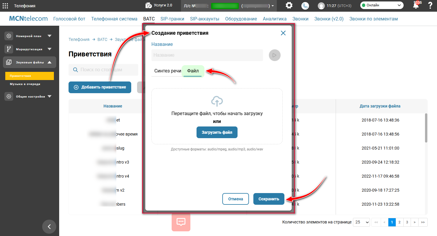 По умолчанию в системе существует один звуковой файл с приветствием голосового меню. Вы можете использовать его при настройке IVR или загрузить свои приветствия и другие сообщения.