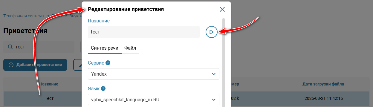 После создания или загрузки файла приветствия его можно будет прослушать, нажав на кнопку пуска.