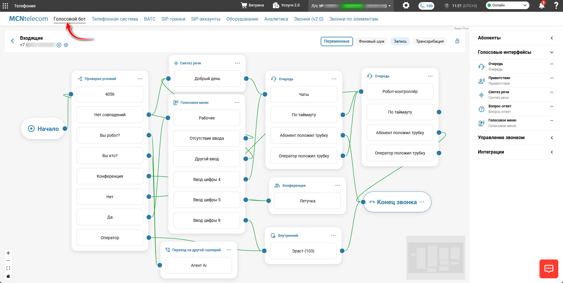 - Голосовое меню — выбор голосового меню, в котором при входящем звонке будут озвучены варианты маршрутизации звонка в зависимости от нажатия цифры. См.: «Элемент «Голосовое меню».