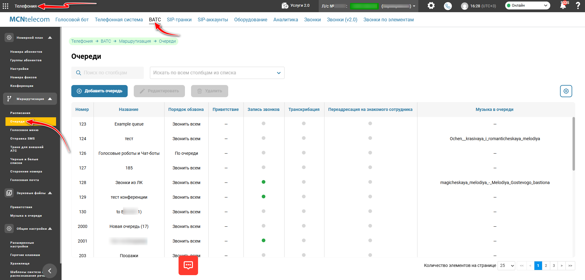 - Каждая очередь имеет свой внутренний номер, на который можно непосредственно позвонить или переадресовать вызов с телефонного номера компании;