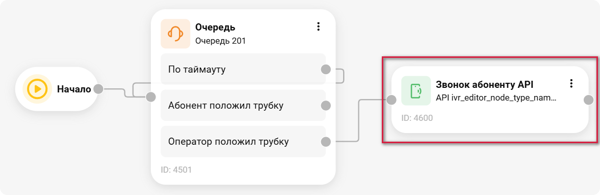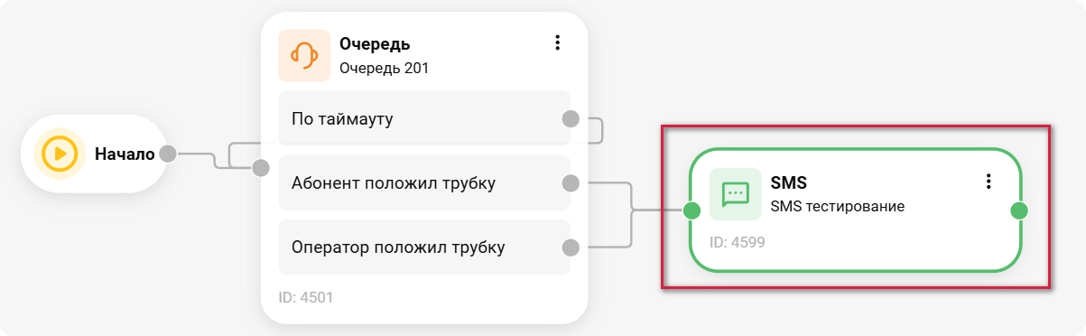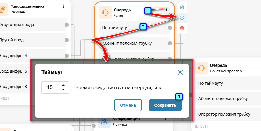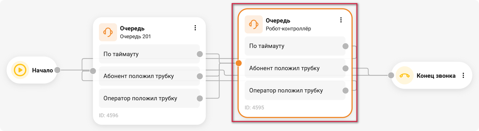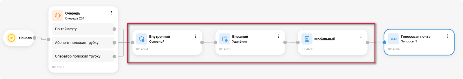 Когда все абоненты в очереди оказались заняты, и никто не смог принять звонок клиента, он может быть потерян. Для того, чтобы этого не произошло, после элемента «Очередь» требуется добавить подходящий элемент и задать его настройки. Добавьте все необходимые элементы и соедините их стрелками для того, чтобы задать последовательность.