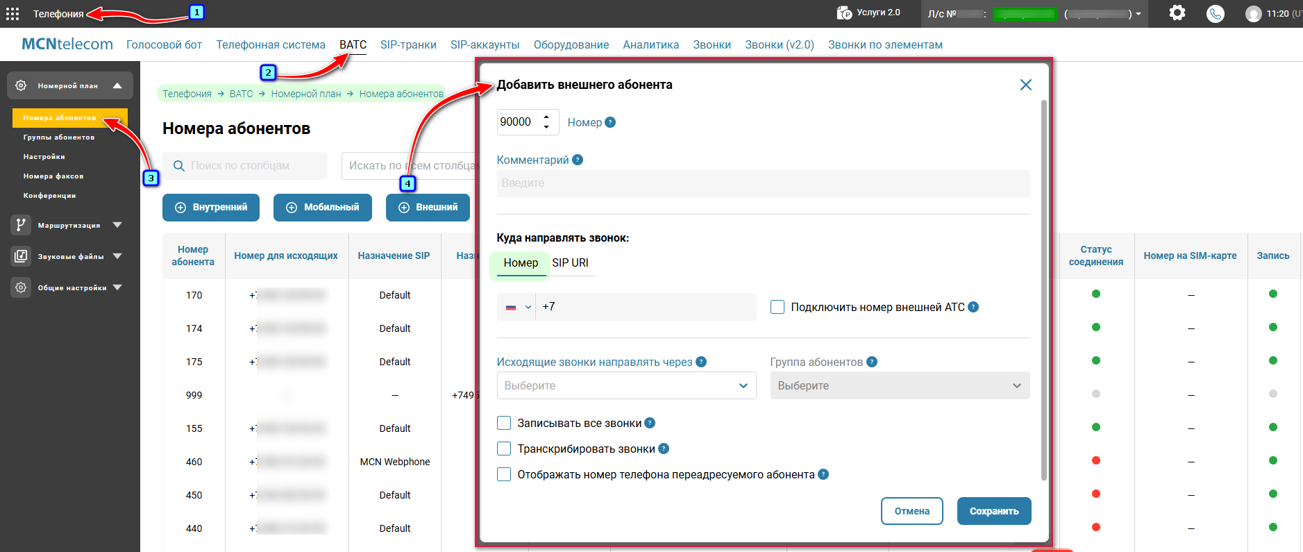В открывшемся модальном окне «Добавить внешнего абонента» задайте параметры:
