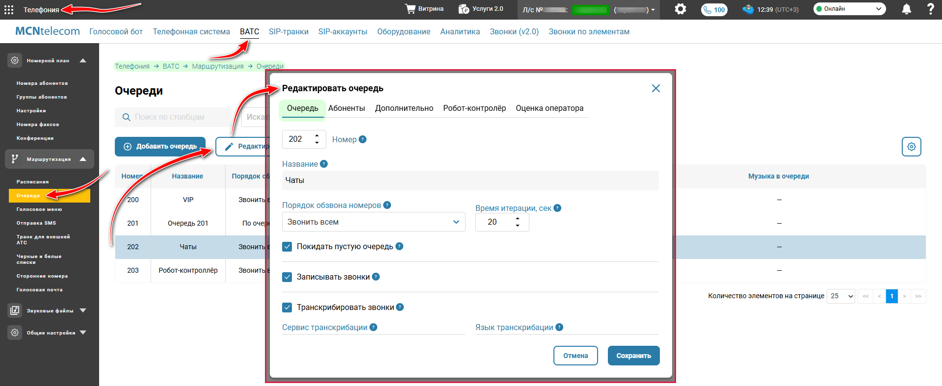 Чтобы настроить приоритеты и алгоритмы очереди, перейдите в верхнем меню в раздел «Телефония» → вкладка «ВАТС» → меню слева «Маршрутизация» → «Очередь». Выберите очередь и нажмите кнопку «Редактировать».