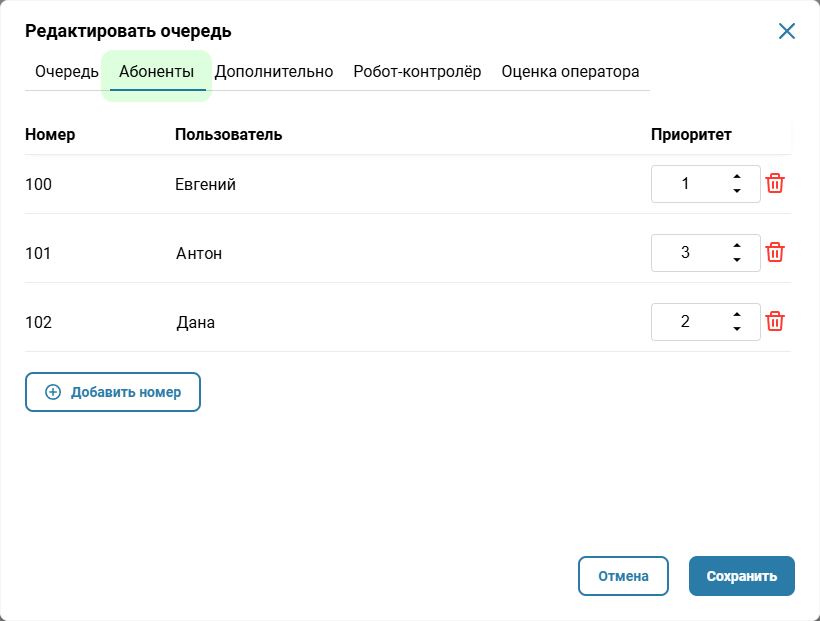 На вкладке «Абоненты» — Если при поиске свободного оператора следует учитывать его квалификацию и в первую очередь направлять звонки более квалифицированным сотрудникам, установите приоритет для каждого абонента. Первым звонок пойдет тому абоненту (группе абонентов), для которого установлен приоритет «0», затем — «1» и так далее.