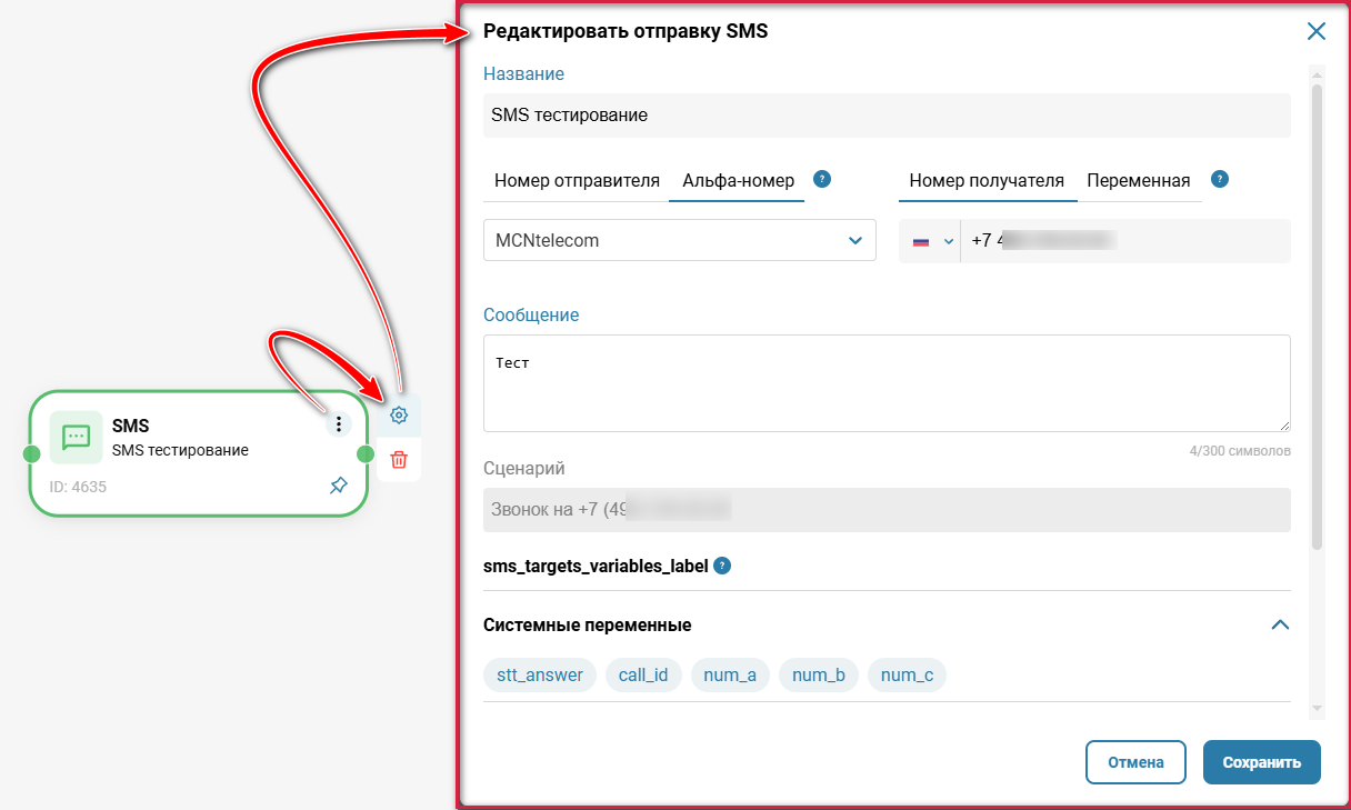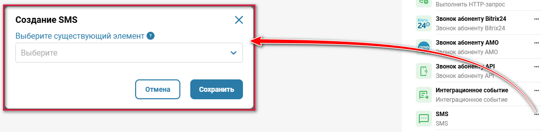 Элемент «SMS» может использоваться в сценарии звонков, как дополнительное информирование клиента о скидках, акциях или других специальных предложениях, которые могут заинтересовать клиента. Так же возможно оповещение менеджера о сделанном ему звонке.