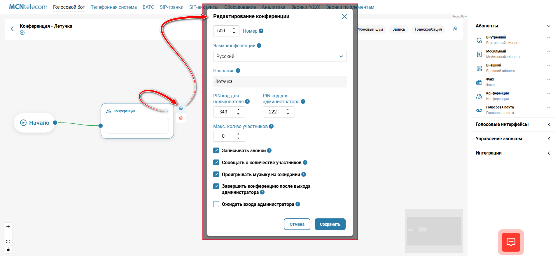 | ✅ Примечание: Чтобы в конференции могли участвовать абоненты, номера которых не входят в виртуальную АТС, следует добавить конференцию в сценарий звонков и корректно настроить маршрут звонков сторонних абонентов. Подробнее см. «Как предоставить доступ к конференции». |