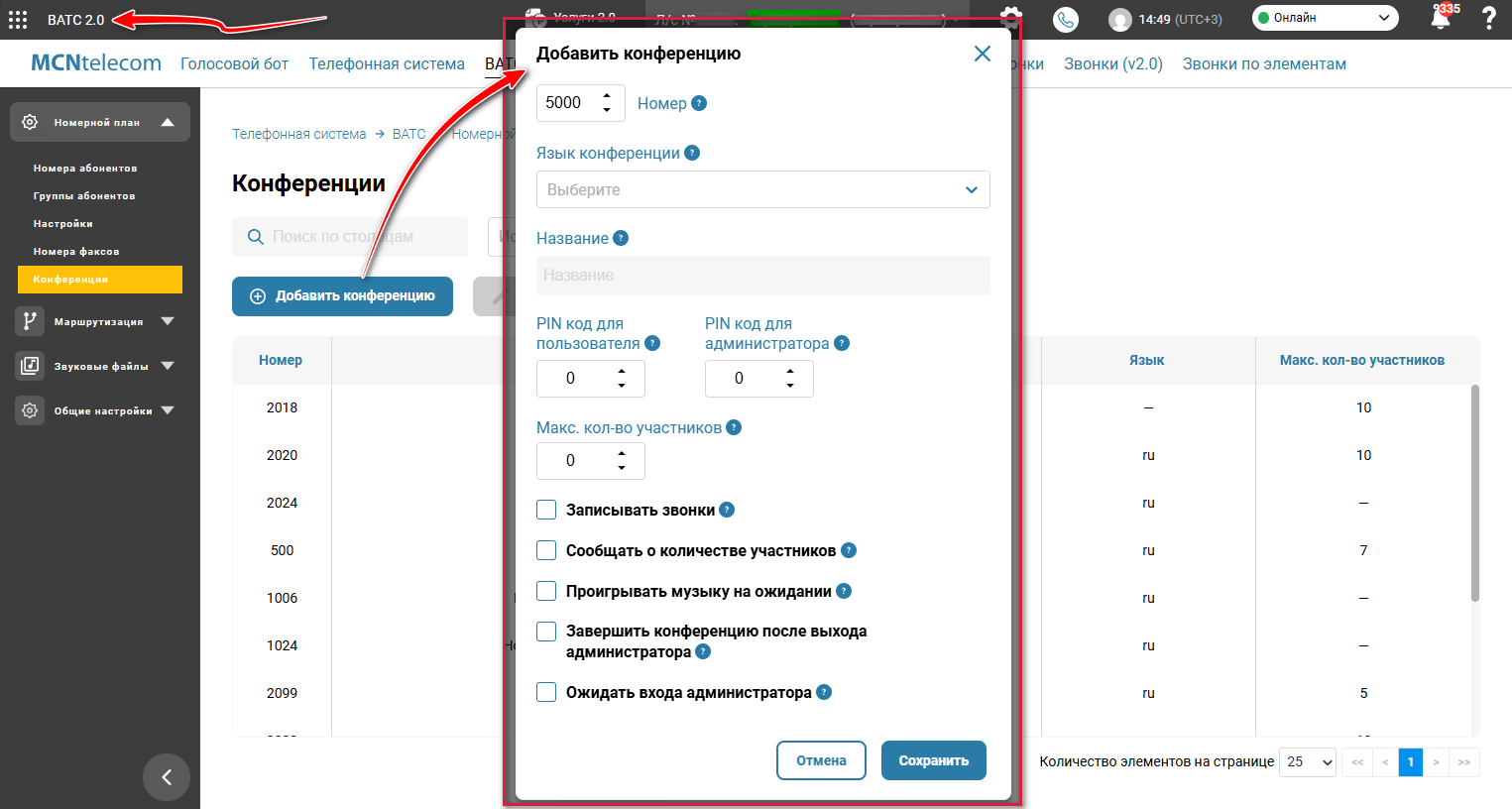 Для создания новой конференции перейдите в раздел «ВАТС 2.0» → вкладка «ВАТС» → меню слева «Номерной план» → «Конференции» и нажмите на кнопку «Добавить».