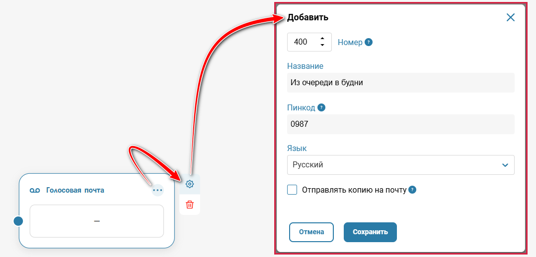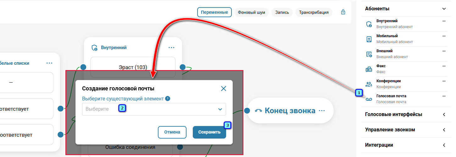 В разделе «Телефония» → вкладка «Сценарий звонков» → справа в боковом меню нажмите на три точки напротив элемента «Голосовая почта».