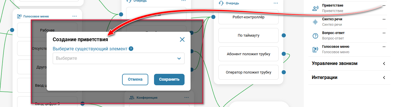 - Для редактирования элемента — нажмите на три точки, затем на кнопку в виде шестерёнки. В модальном окне «Редактирование элемента сценария» выберите форму приветствия: