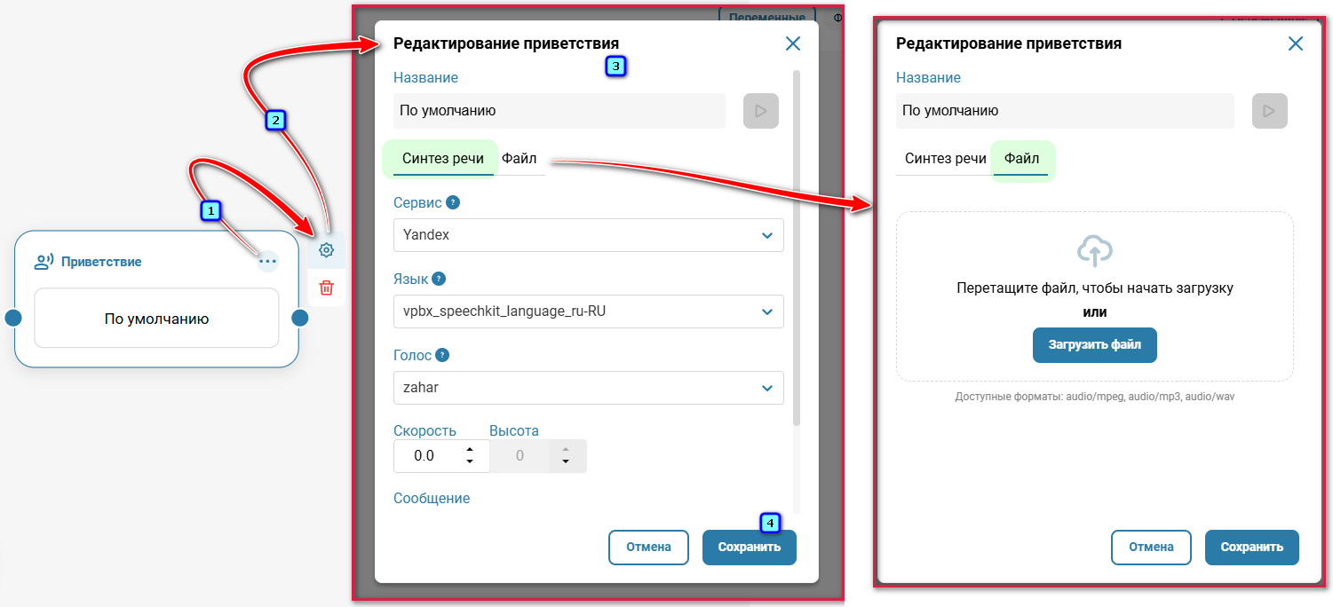 Приветствие — выбор звукового сообщения с заранее загруженным файлом, либо синтез текста в речь.
