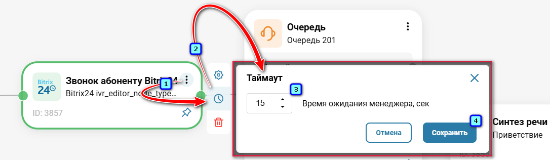 Сценарий маршрутизации настраивается в разделе «ВАТС» → «Настройки» → «Сценарии звонков». Для элемента «Звонок Абоненту Bitrix24» вы можете задать временной интервал, по истечении которого, если сотрудника не ответил, то звонок будет перенаправлен дальше по маршруту. Таким образом, звонок клиента не будет потерян.