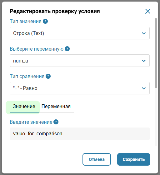 - Сравнить с переменной — функция сравнивания переменной с переменной. При включении, вместо постоянного значения для сравнения вносится название переменной;