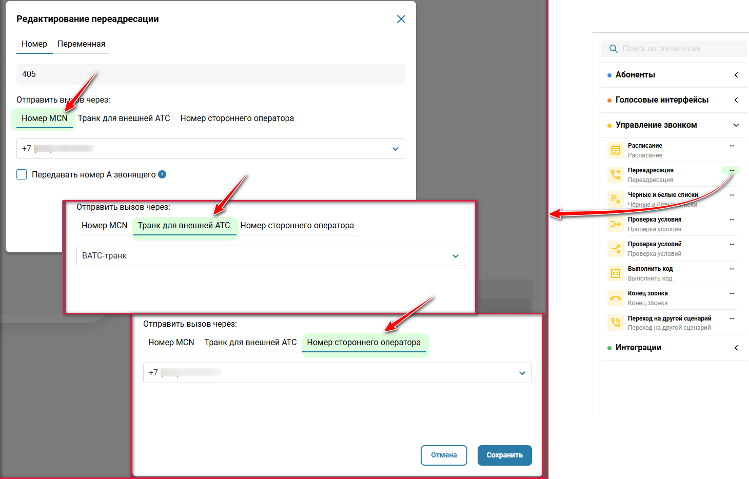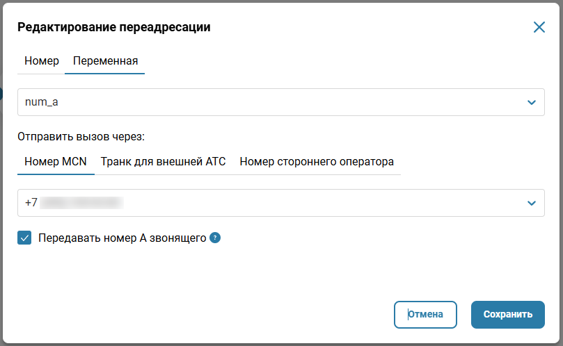 Выберите вариант переадресации — Номер MCN, Транк для внешней АТС, Номер стороннего оператора и в соответствии с вариантом выберите номер или транк.
