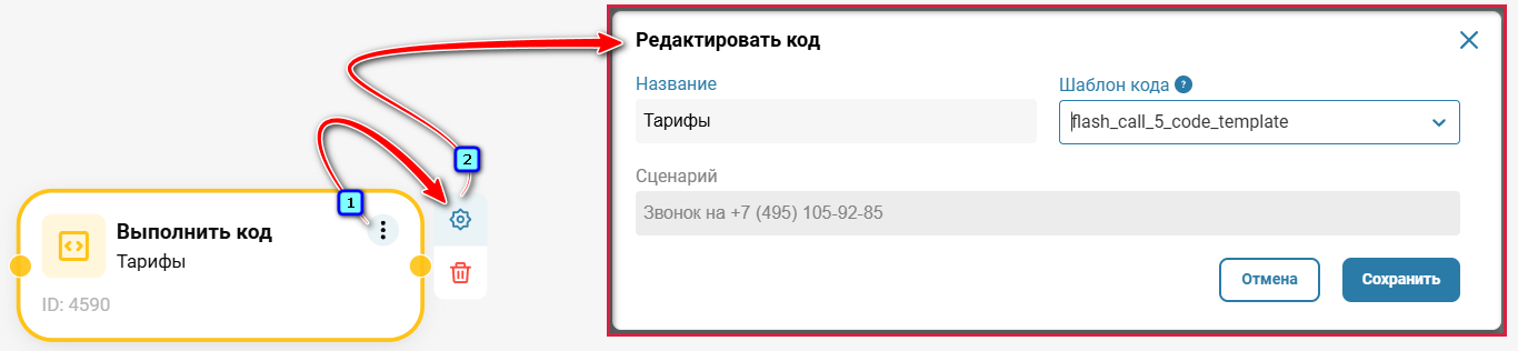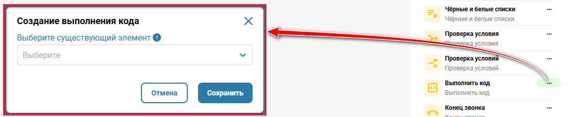 В разделе «Телефония» → вкладка «Голосовой бот» → справа в боковом меню нажмите на три точки на иконке элемента «Выполнить код».