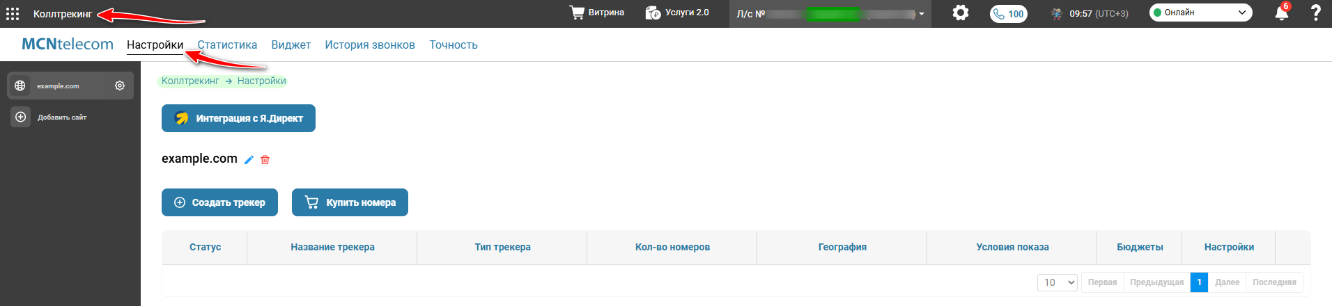 Для настройки коллтрекинга перейдите в верхнем меню ЛК в раздел «Коллтрекинг» → «Настройки».