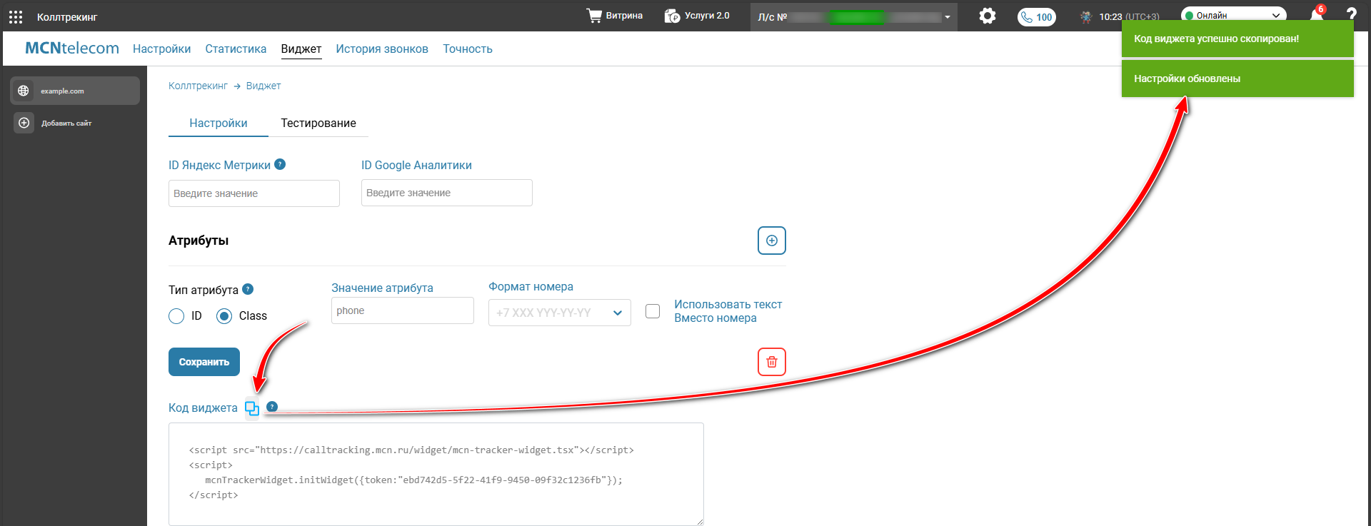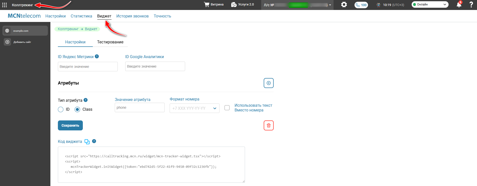 1. Для настройки перейдите в раздел «Коллтрекинг» в меню слева выберите сайт коллтрекинга, затем вкладку «Виджет».