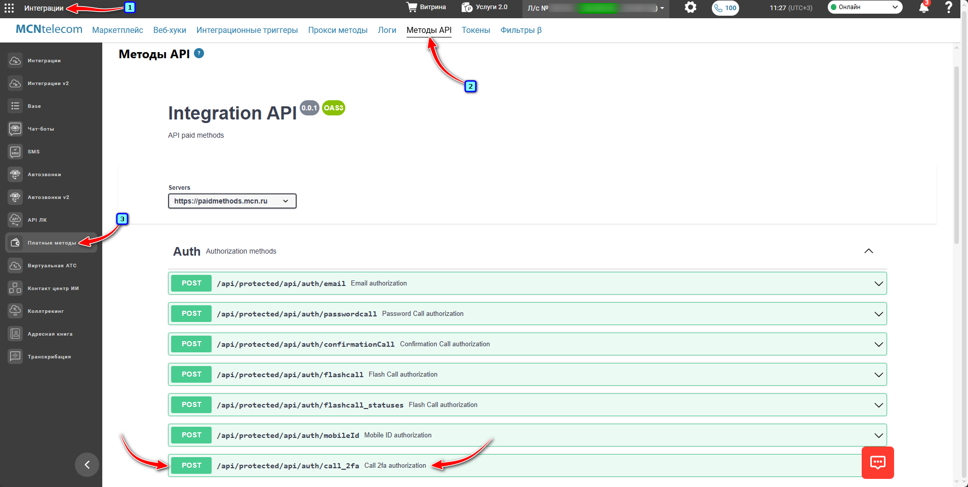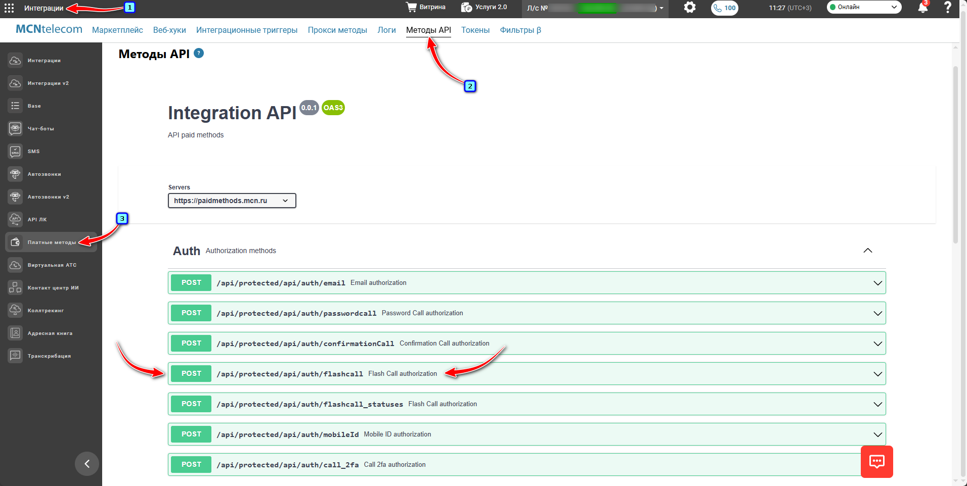 Post /api/protected/api/auth/flashcall в разделе «Интеграции» → вкладка «Методы API» → меню справа «Платные методы» → «Auth» → «Authorization methods».
