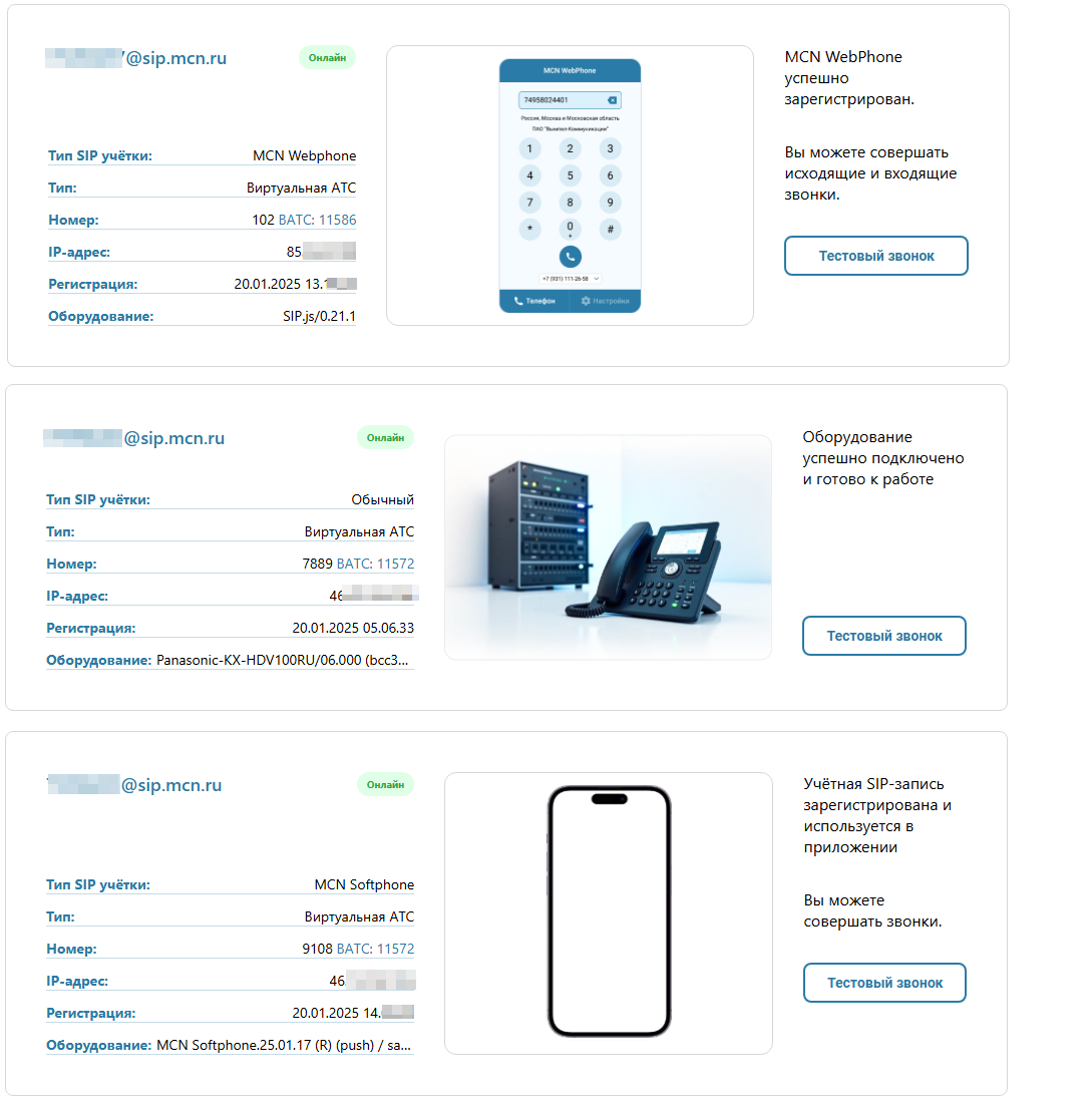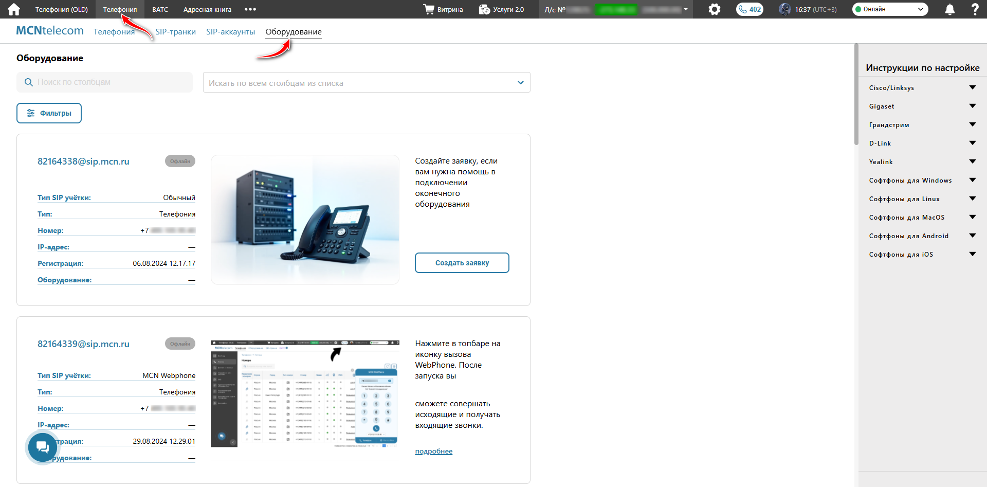 - Оборудование (модель VoIP-телефона, параметры MCN Softphone, MCN WebPhone).