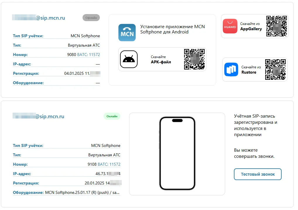 Если MCN Софтфон уже установлен, и пользователь находится онлайн, вместо QR-кода отобразятся параметры оборудования, и будет доступен тестовый звонок.