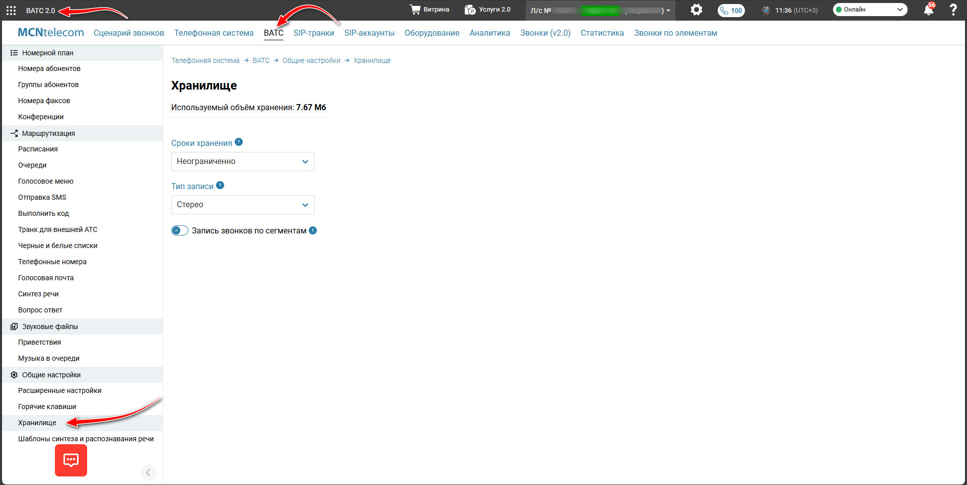 Записи разговоров, информация о звонках и звуковые файлы хранятся в виртуальной АТС на сервере. У записей есть максимальный срок хранения, который настраивается в разделе «Телефония» → вкладка «ВАТС» → меню слева «Общие настройки» → «Хранилище».