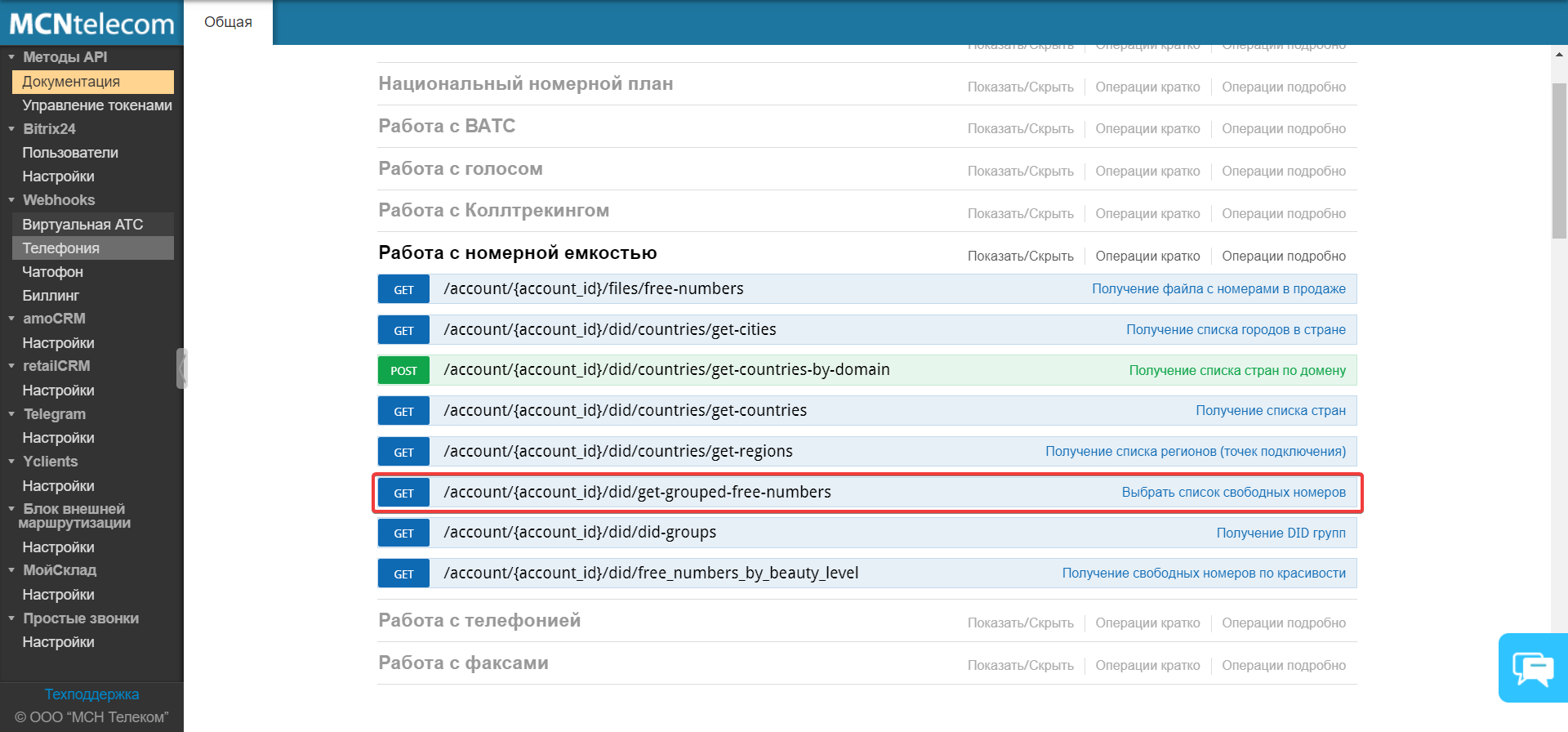 - На главной странице Личного кабинета «Главное меню» в верхнем меню выберите пункт «API». В левом меню выберите раздел «Методы API | Документация». Раскройте группу методов «Работа с номерной емкостью» и вызовите метод «GET /account/{account_id}/did/get-grouped-free-numbers» (Выбрать список свободных номеров).