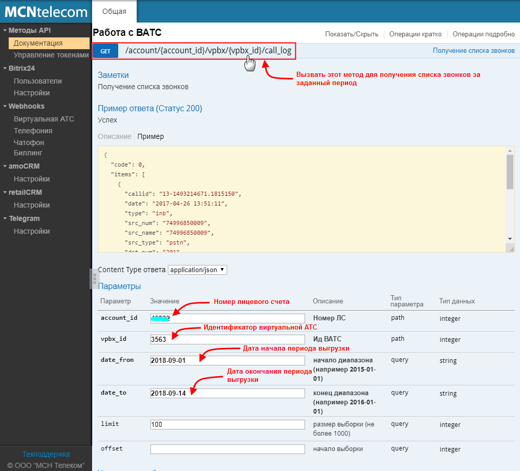 | ✅ Примечание: Данный раздел предназначен для клиентов, предпочитающих выгружать статистику звонков с сервера MCN Telecom через API и обрабатывать ее в своей CRM-системе. |