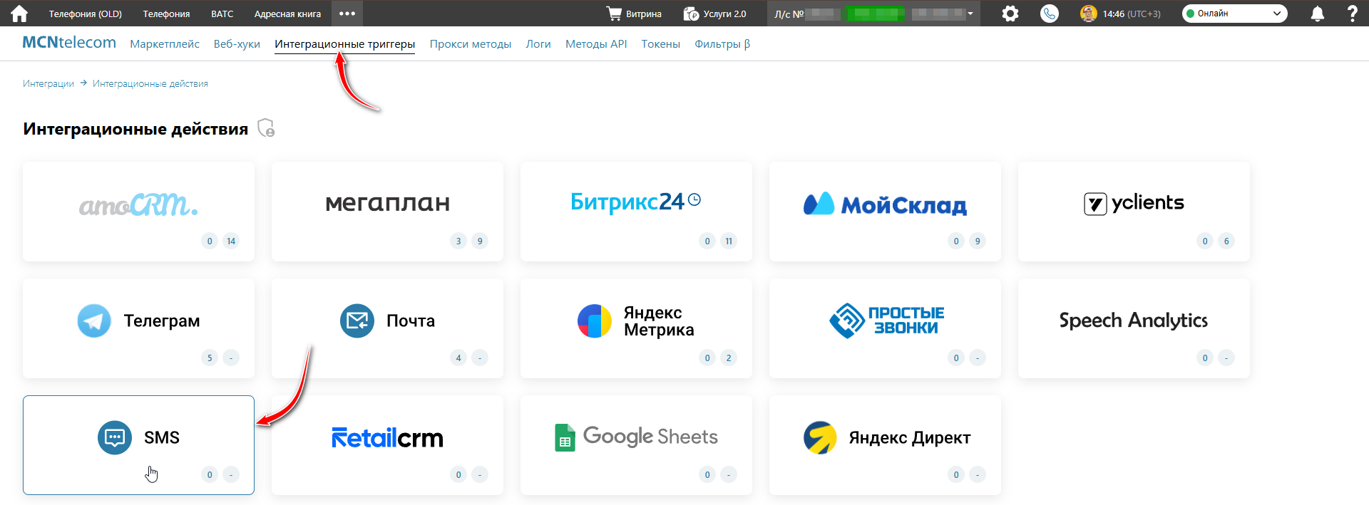 Для создания триггера перейдите в раздел «Интеграционные триггеры» и нажмите на блок «Интеграции с SMS».