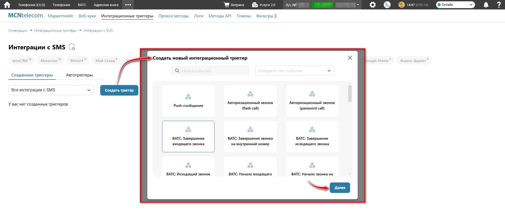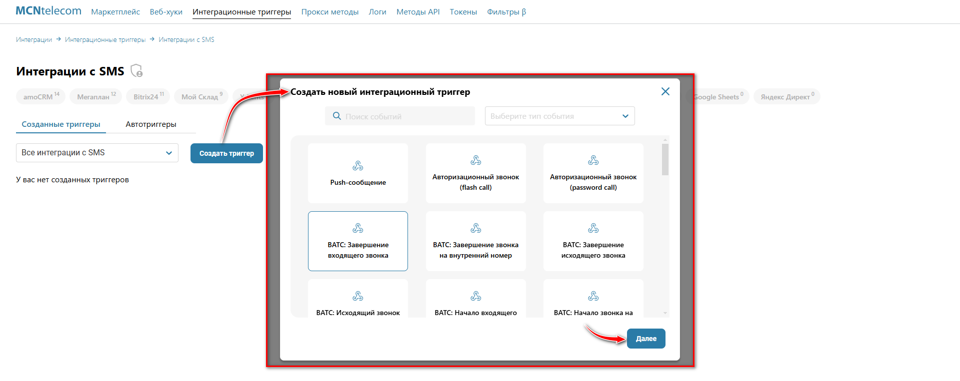 Нажмите на кнопку «Создать триггер» и выберите интересующее событие. В данном примере это «ВАТС: Завершение входящего звонка», когда номер привязан к Виртуальной АТС. И нажмите «Далее».