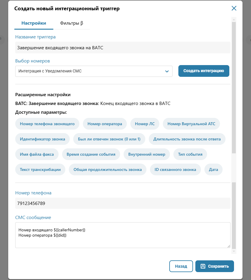 Теперь можно приступать к тестированию функционала. При каждом завершении звонка на указанный вами номер телефона будет приходить сообщение как на скриншоте ниже.